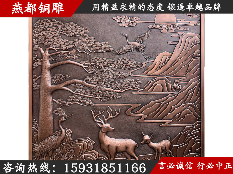 >> 銅浮雕 >> 燕都銅雕工程案例——別墅庭院紫銅鍛造迎客松銅影壁浮雕